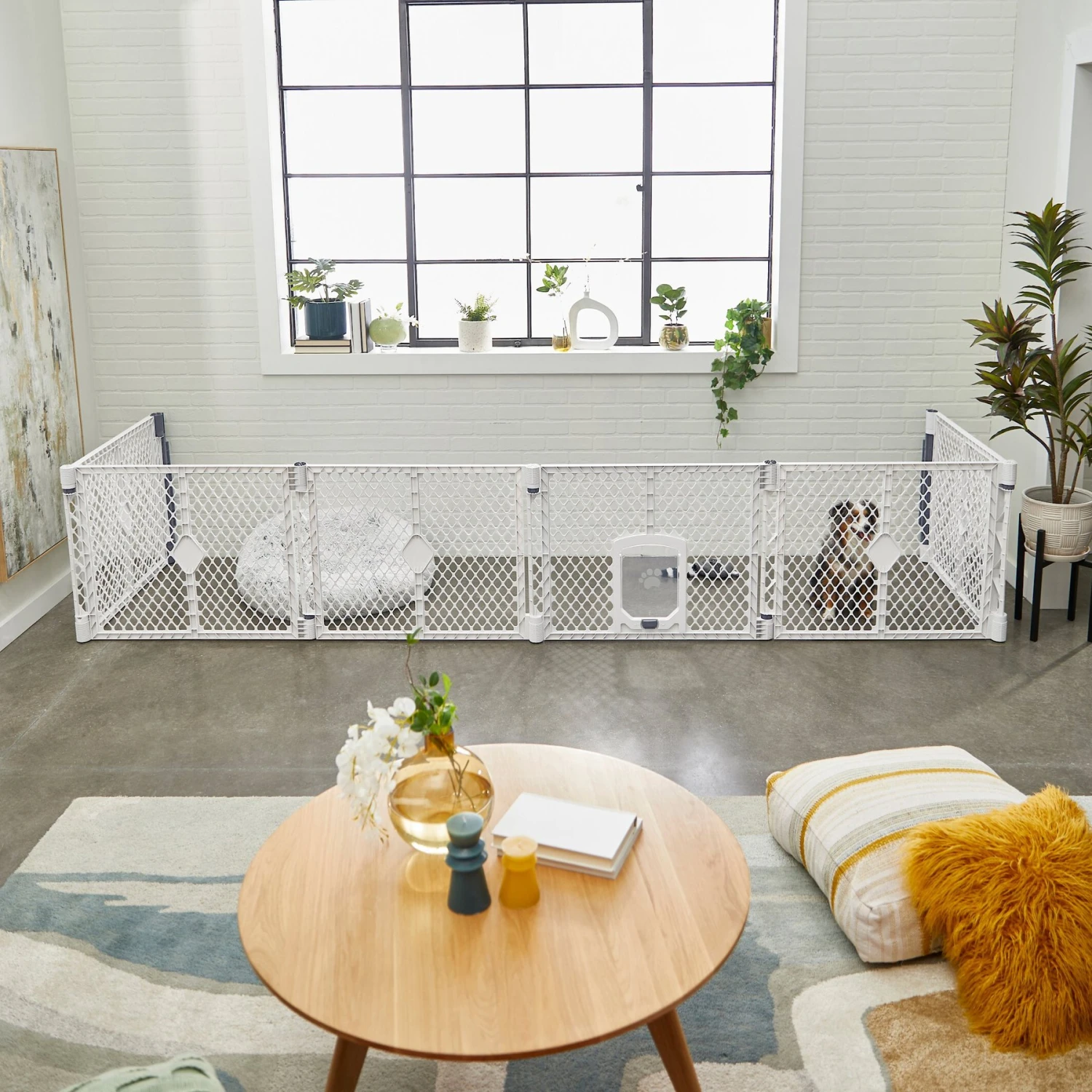 - Creates a secure space for your pup as a freestanding pen with a 19.10 square feet enclosure or use it as an extra-wide barrier for openings up to 201 inches wide.