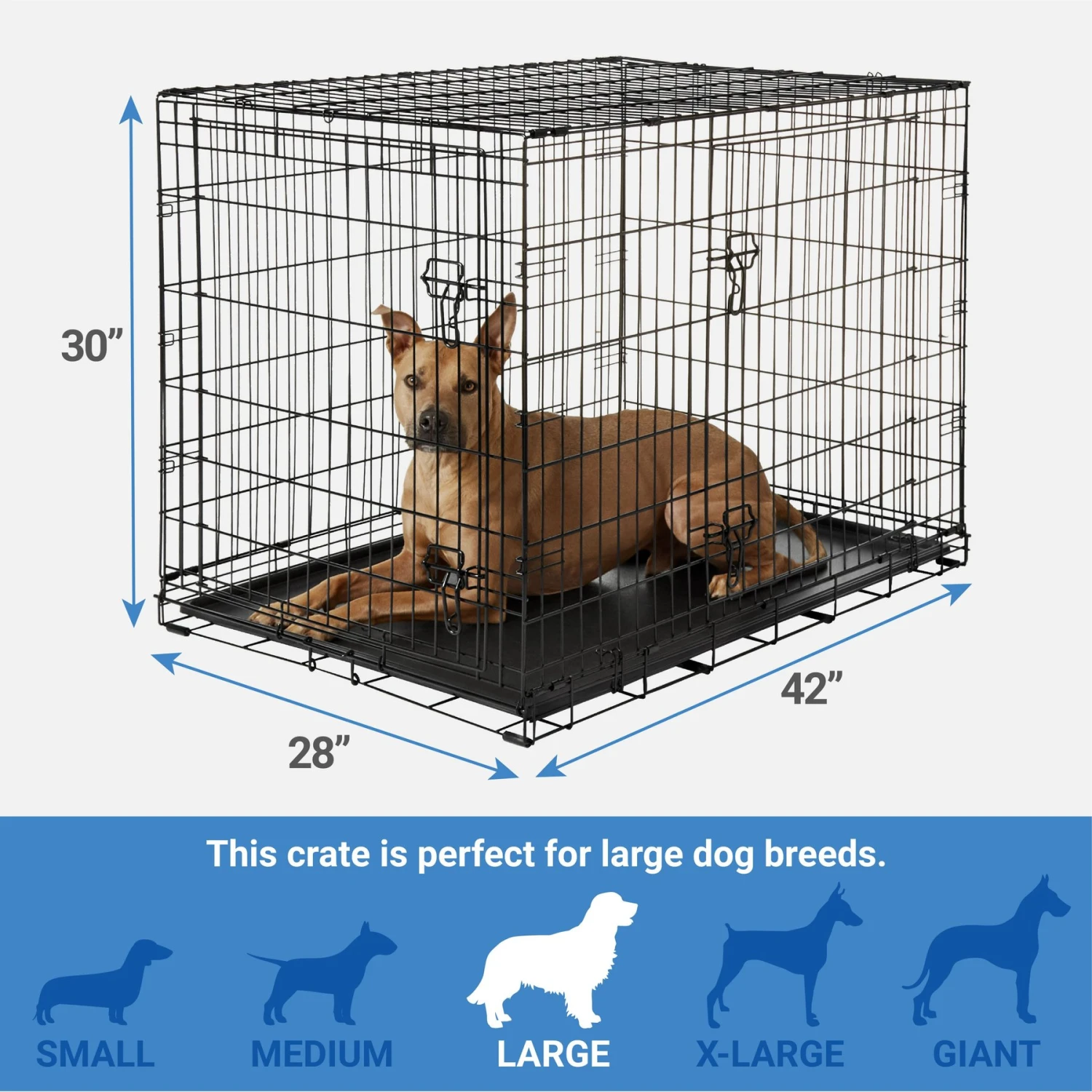 Frisco Fold & Carry Double Door Collapsible Wire Dog Crate, 30 inch — Remember to measure your pet for the paw-fect fit. Frisco Fold & Carry Double Door Dog Crate is constructed to be strong and durable while providing your pet with safety, security and comfort. Two large doors, one on the front and one on the side, are easy to open, close and securely lock with dual latches on larger models.