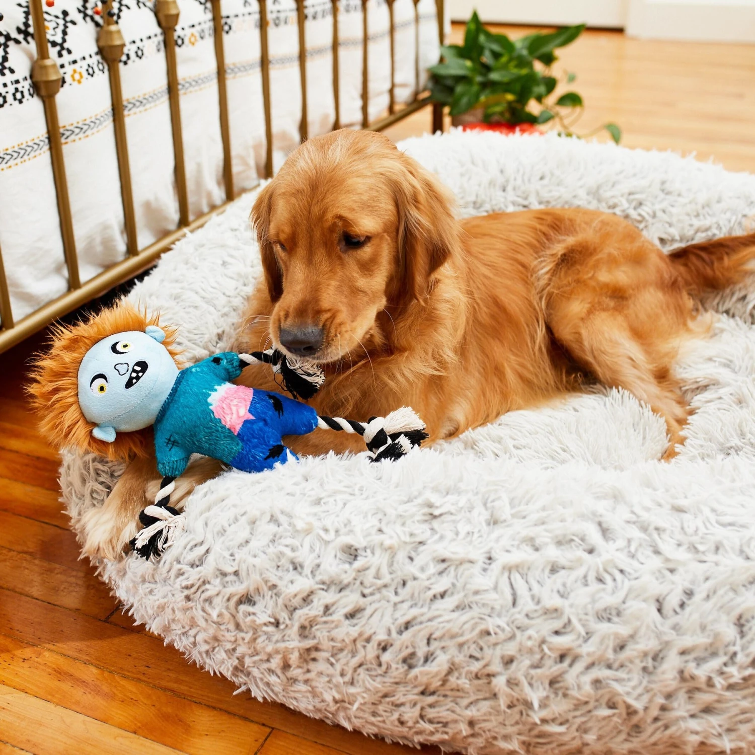 They’re alive! This super cute zombie toy is always ready for playtime. With a soft, plush body, your pup will love giving it a really good squish. The knotted rope in the arms and legs makes for a ghoulishly good time and interactive fun with you. Toss it, wiggle it, play fetch, too! This zombie cutie goes squeak in the night with two internal squeakers so you can turn up the spooky fun for all their Halloween games.